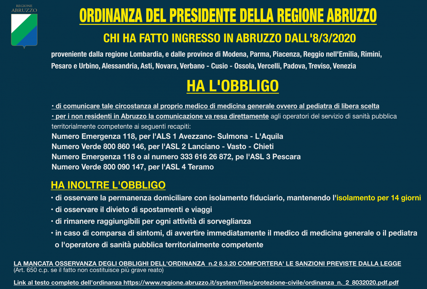 Ordinanza del Presidente della Regione per chi ha fatto ingresso in Abruzzo dall'8 marzo 2020.